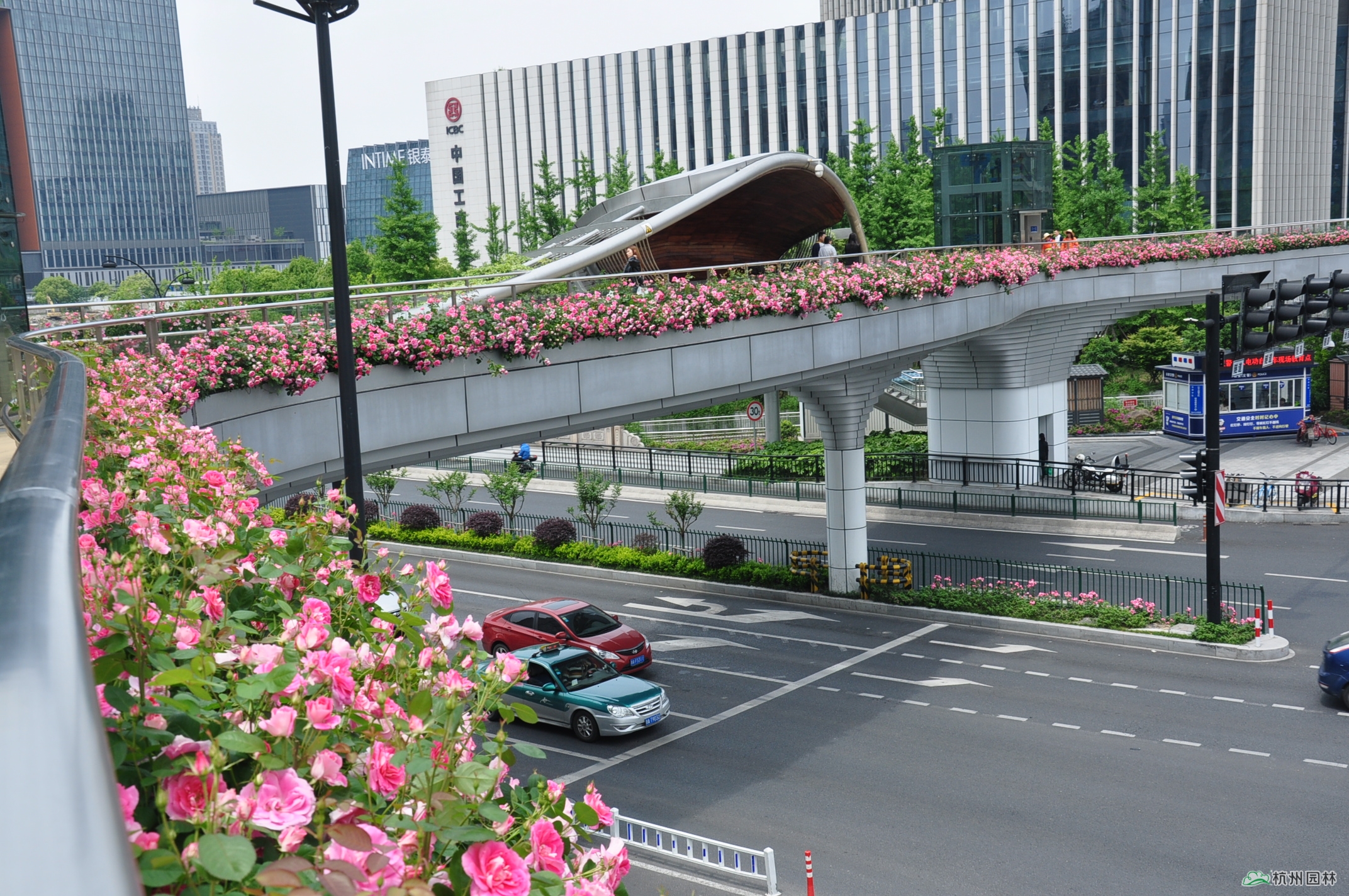 位于新塘路和慶春路交叉口的慶新天橋是新塘路綜合整治工程的標(biāo)志性建筑之一,也是杭州首座仿生態(tài)學(xué)原理的異形人行天橋。橋面獨(dú)特的景觀造型宛如一條風(fēng)景秀美的彩色飄帶,大量月季沿橋面外側(cè)護(hù)欄種植,月季花盛開(kāi)時(shí)節(jié),橋面仿佛戴上了一條色彩絢麗的花環(huán),美不勝收,充分體現(xiàn)了杭州包容、大氣、開(kāi)放的時(shí)代風(fēng)貌、都市氣質(zhì)和國(guó)際視野。