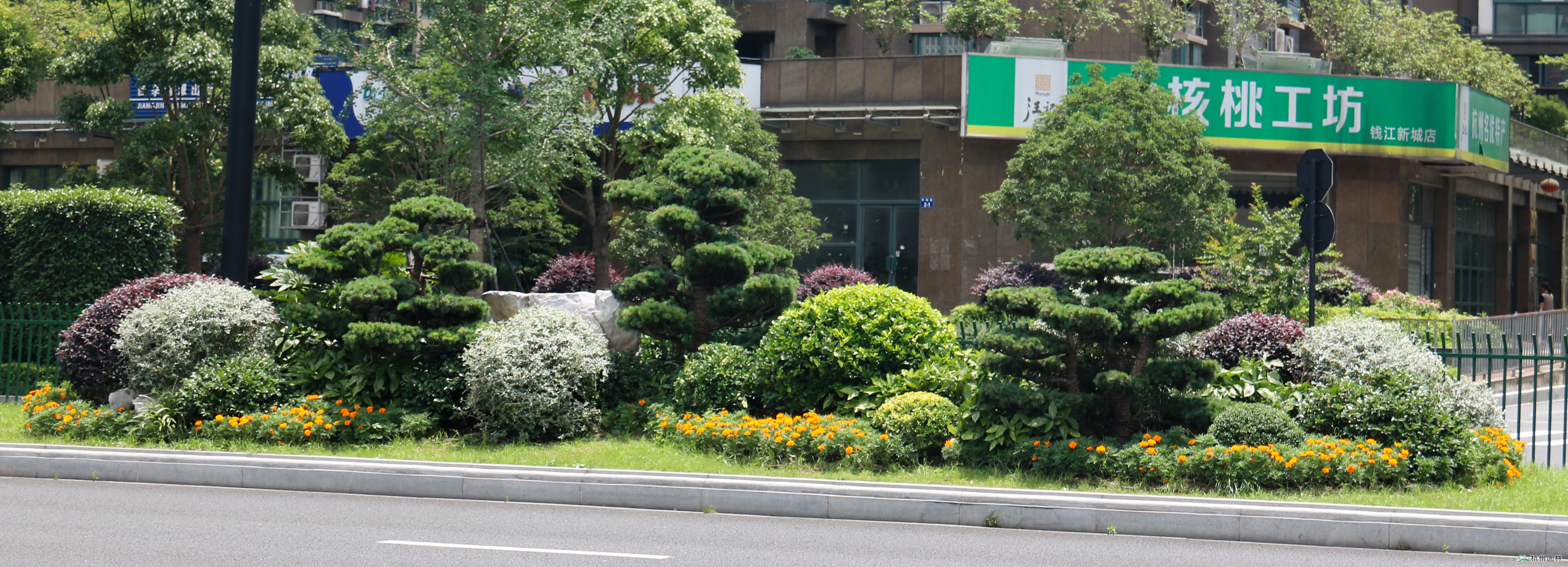 新塘路的植物選擇在確保品種豐富、色彩多變的基礎(chǔ)上,大量選用冠型飽滿、枝條健壯、色彩鮮明的鄉(xiāng)土樹(shù)種。行道樹(shù)以香樟為主,枝葉茂密而秀麗,遮蔭良好;機(jī)非隔離帶以銀杏為主,樹(shù)冠濃密,樹(shù)干通直,樹(shù)形美觀,是優(yōu)良的觀賞樹(shù);中央隔離帶以樸樹(shù)、櫻花、紅花檵木球、紅楓及造型羅漢松為主,營(yíng)造出濃郁的杭州特色。