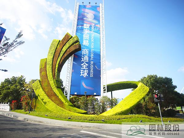 為增加數(shù)貿(mào)展會(huì)主題在邊側(cè)帶內(nèi)設(shè)置3座綠雕:杭扇-以扇子造型主題的全球數(shù)字貿(mào)易博覽會(huì)綠雕,展-以全球數(shù)字貿(mào)易博覽會(huì)會(huì)徽造型綠雕,數(shù)貿(mào)-以飄帶造型主題的“數(shù)貿(mào)錢潮 杭向未來”綠雕。綠雕植物均采用佛甲草和五色草搭配,周邊采用三角梅及花鏡植物配置。港南大道島頭花鏡運(yùn)用金姬錐、彩葉球、細(xì)葉芒、塞娜等植物來強(qiáng)化迎賓氣氛,通過多年生地被草花,結(jié)合精致植物組團(tuán)+特色綠雕,共同營造多彩氛圍,打造熱烈迎賓門戶。